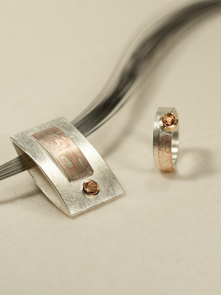 Anhänger und Ring in Silber mit Mokume - Gane und Turmalinen. Eigenanfertigungen aus unserer Werkstatt. Design und Idee "die Goldschmiede stamm & speth"
