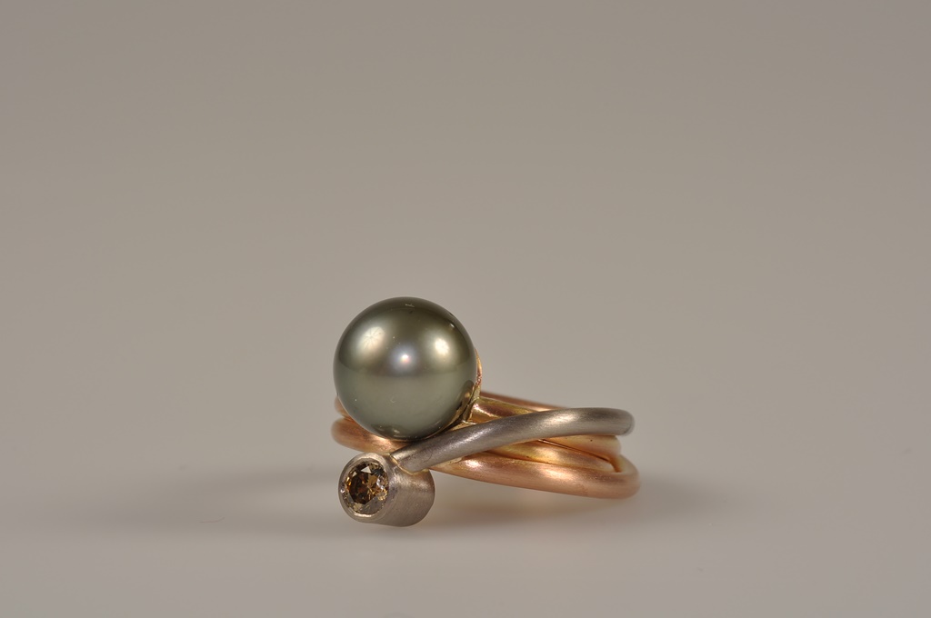 Ring in Rot- und Weißgold mit Tahitiperle und naturfarbenem Brillant. Idee und Design "stamm & speth"